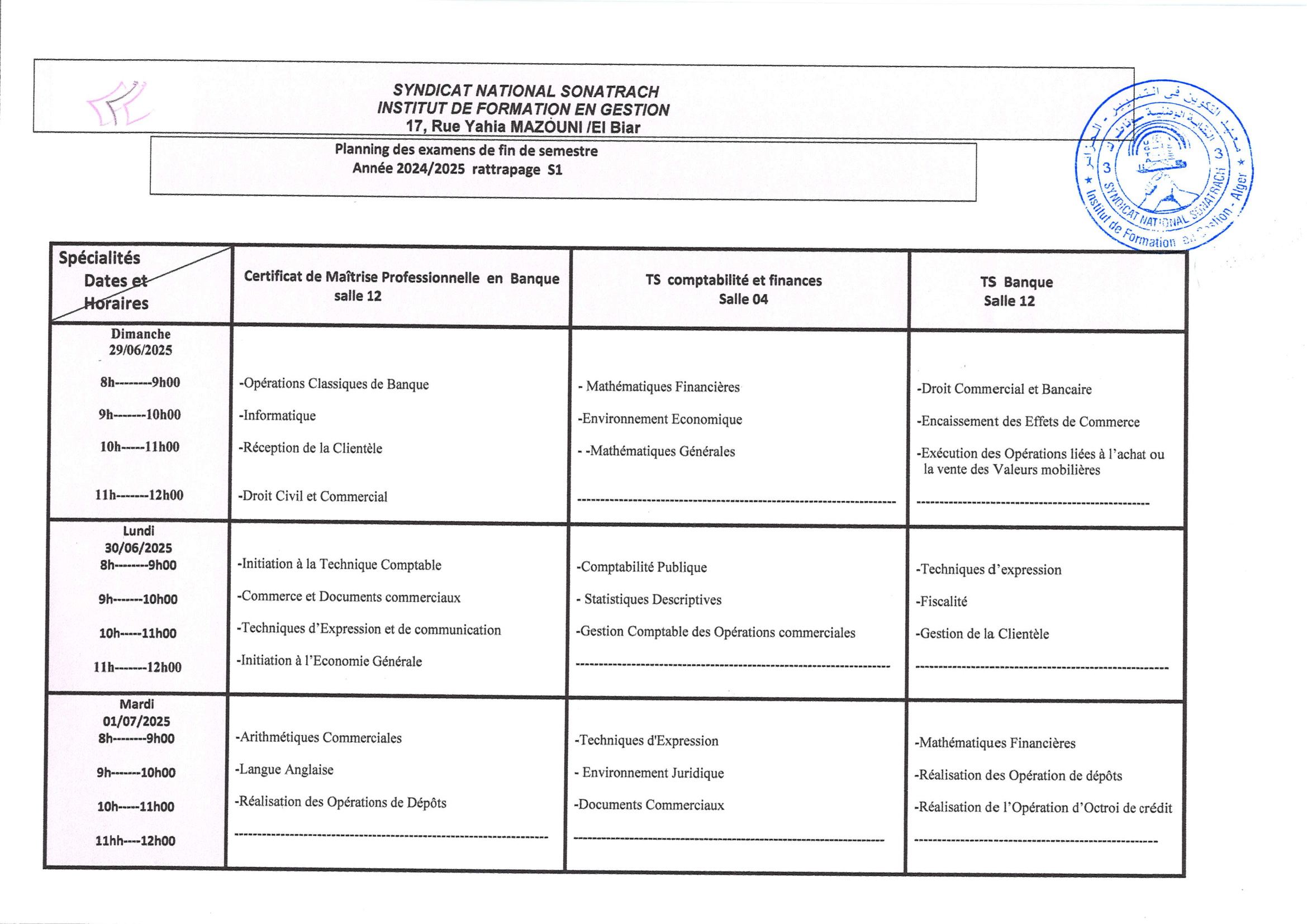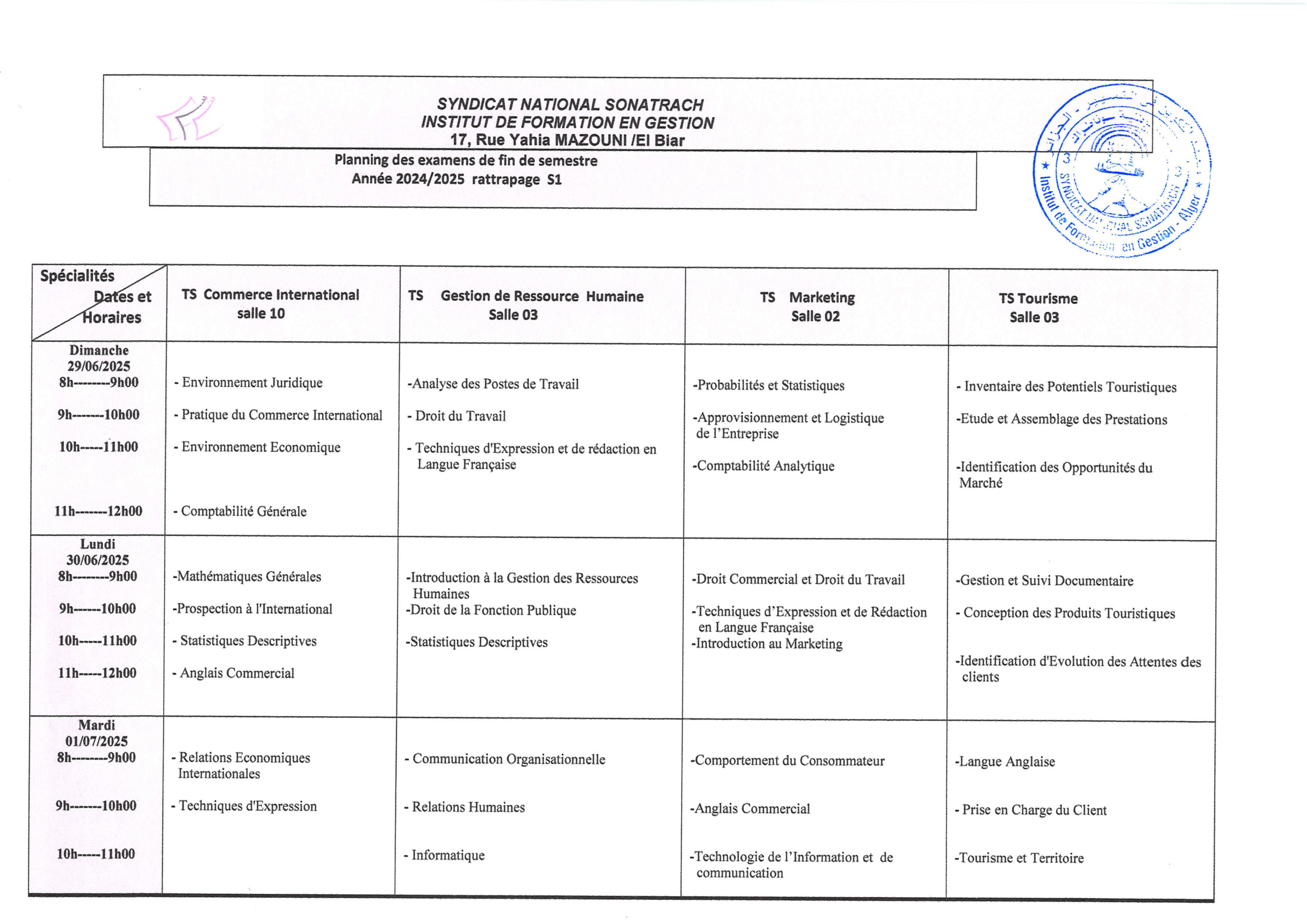 PLANNING DES EXAMENS DE RATTRAPAGE 2024-2025