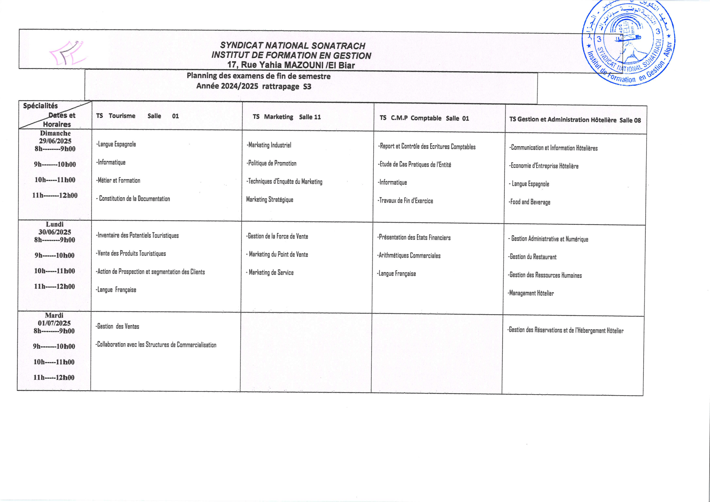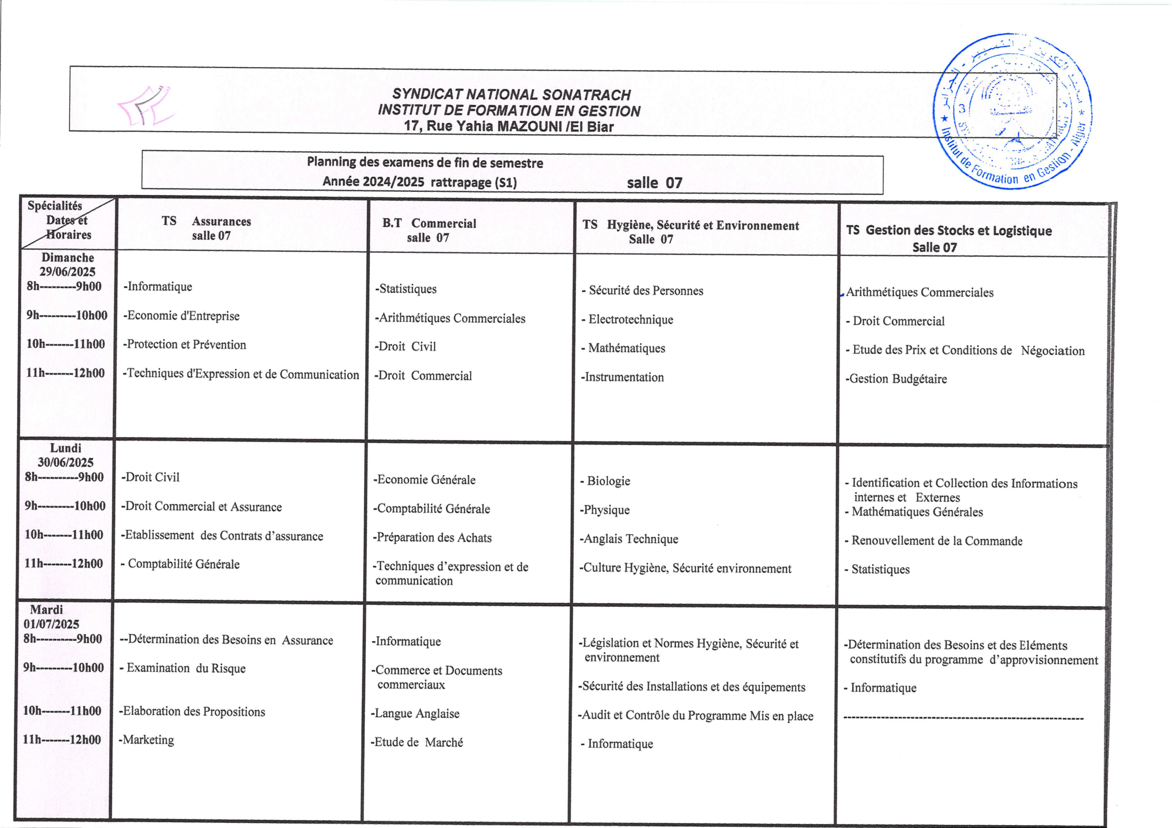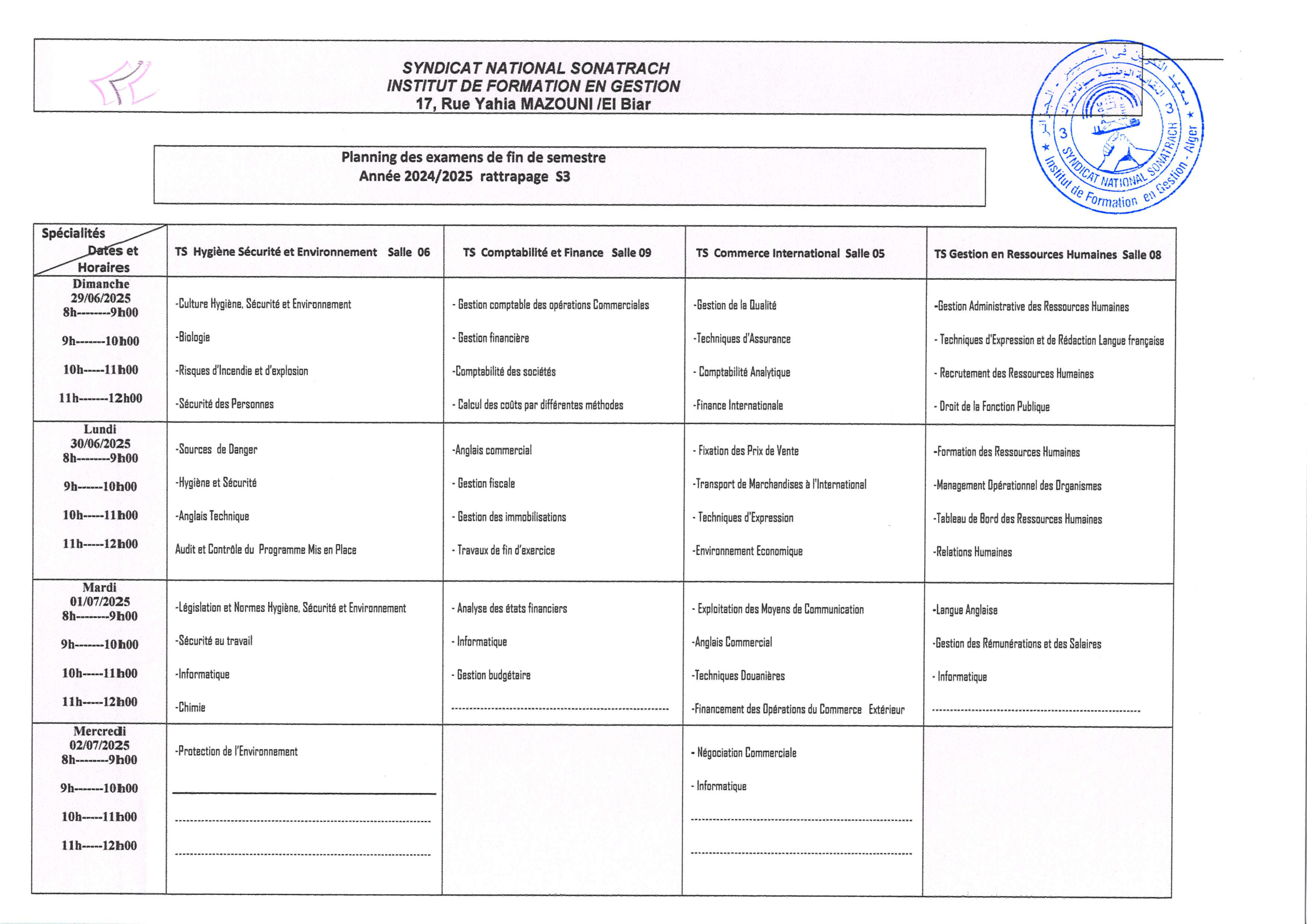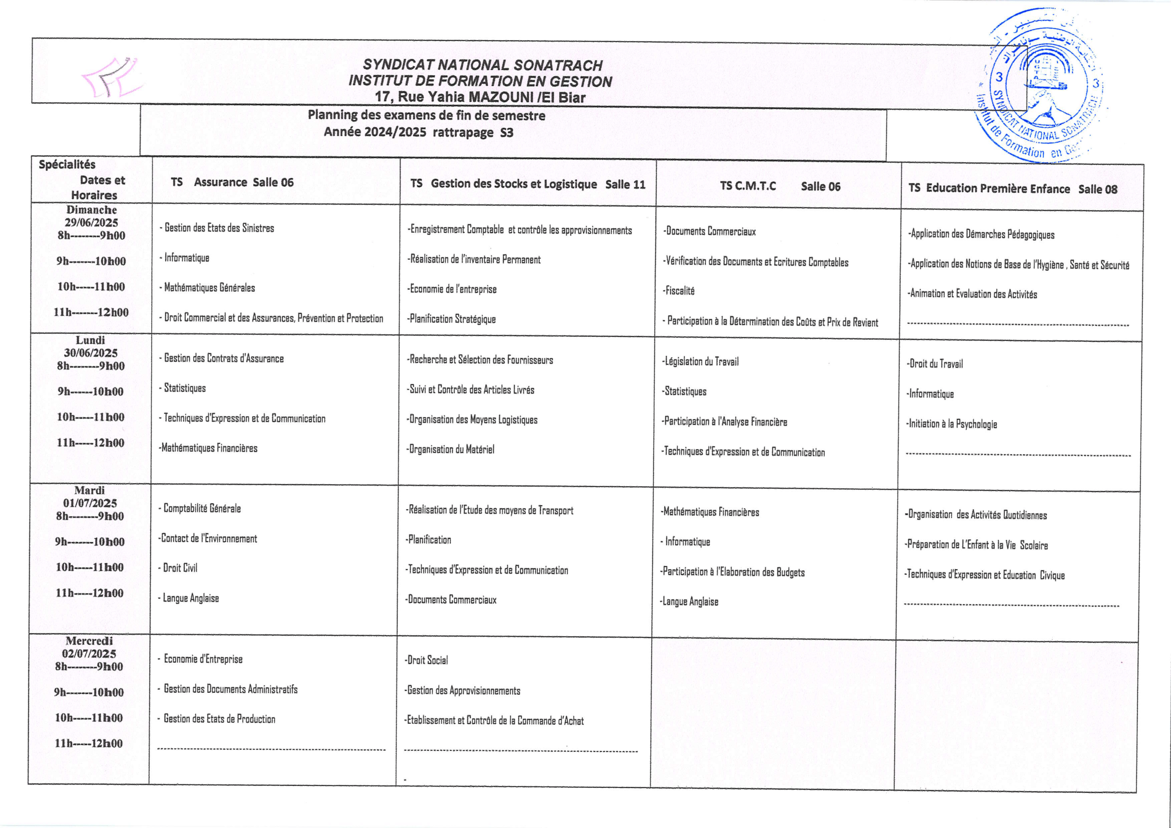 PLANNING DES EXAMENS DE RATTRAPAGE (S3)