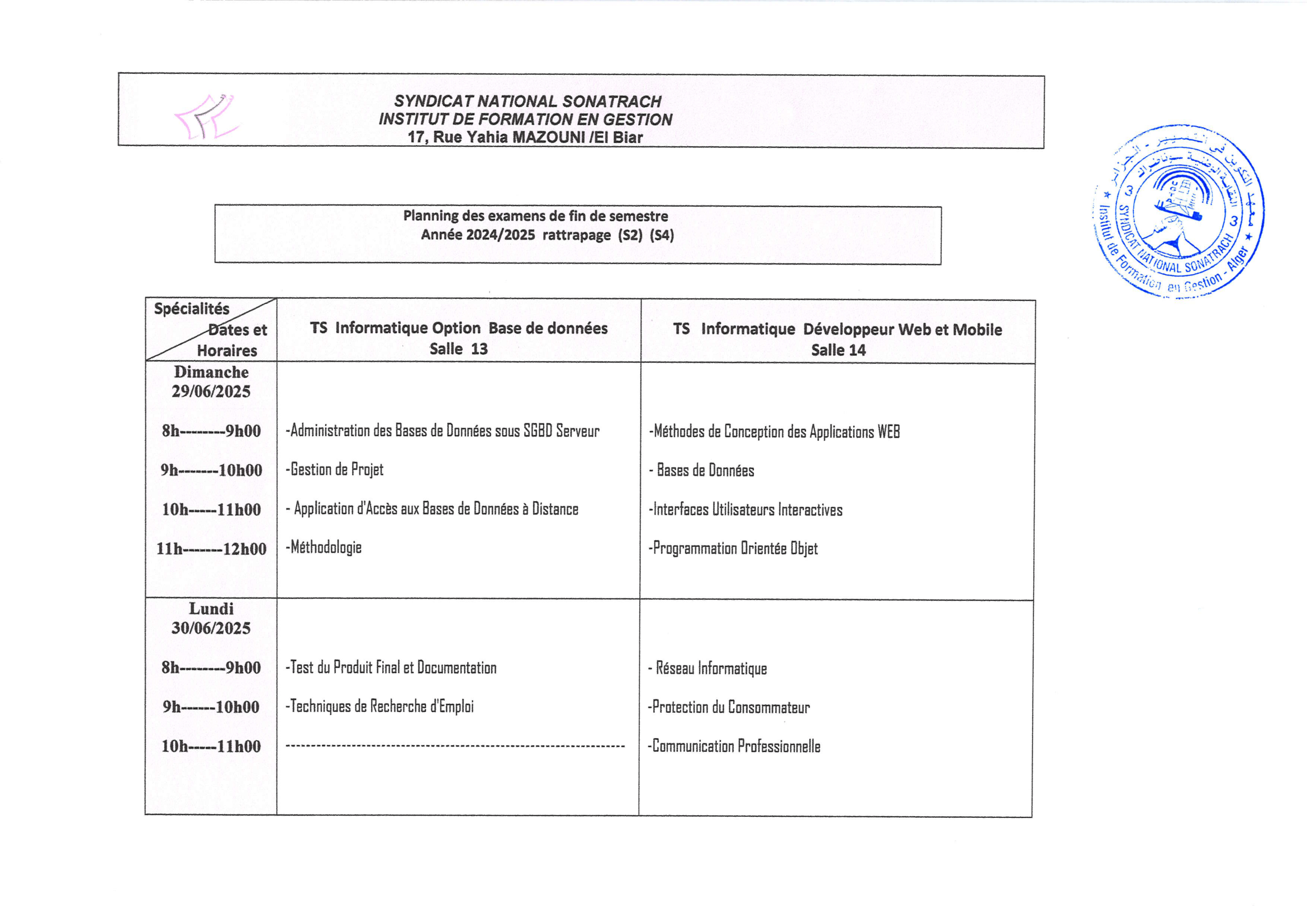 PLANNING DES EXAMENS DE RATTRAPAGE (S2-S4)